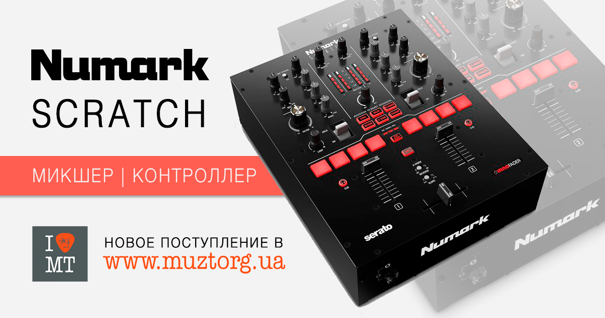 Numark Scratch - двухканальный Dj микшер имеет два независимых канала с идентичным набором управляющих элементов. Устройство обладает двумя фейдерами, 1 кроссфейдером для смешивания каналов, 8 RGB пэдами для установки меток быстрого доступа и запуска семплов, 2 фильтрами, двумя 3-х полосными эквалайзерами, FX секцией и набором дополнительных функциональных кнопок и регуляторов.