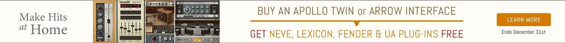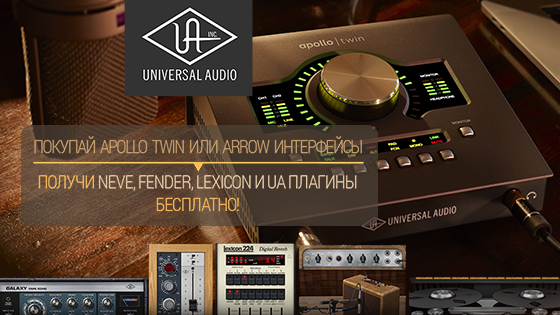 С 1 октября и до 31 декабря 2018 при покупке любоого аудио интерфейс Apollo Twin или Arrow, Вы получаете БЕСПЛАТНО легендарные плагины Neve, Fender, Lexicon и UA, которые придадут вашим трекам легендарного звучания.