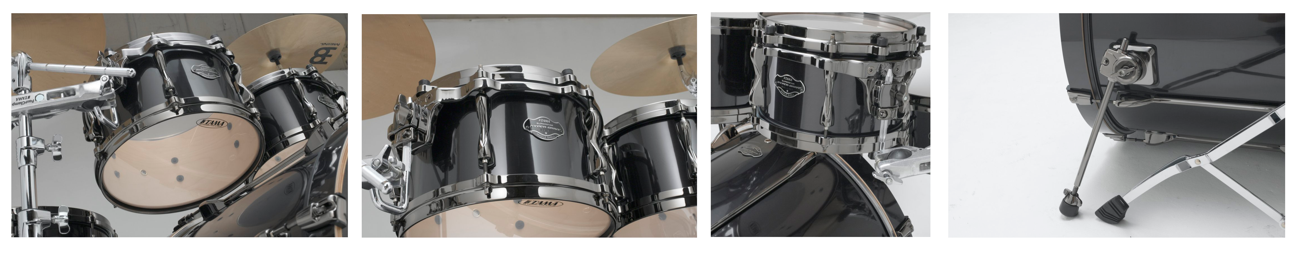Первое, что обращает на себя внимание — нестандартная (уменьшенная) глубина томов, и именно это является главной особенностью серии ТАМА Hyper-Drive. Глубина барабана оказывает непосредственное влияние на характер его атаки. Более "короткие" томы позволяют добиться быстрого отклика и мощного "панча", избавляя от ненужной гулкости и лишних обертонов, которые особенно проявляются при подзвучке ударных. Яркая атака и "пробивной" характер звука делает эти барабаны очень "удобными" для звукорежиссеров, при этом общий тембр и сустейн сохраняются в нужных пропорциях. В этом также немалая заслуга клёна, который ещё сильнее подчеркивает такой характер звучания.