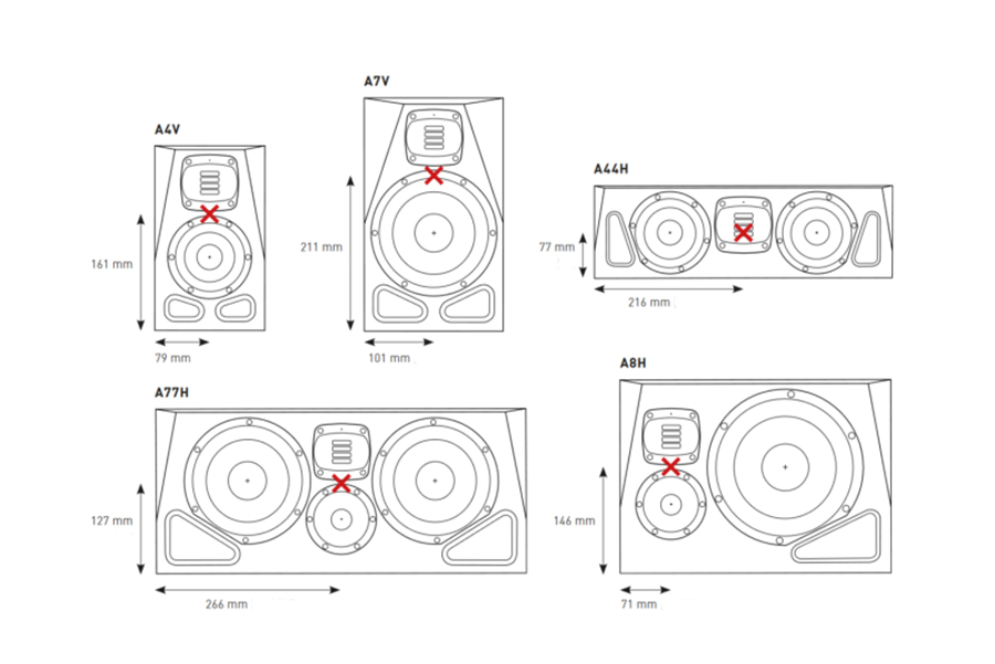 Акустическая ось (красный X) различных моделей серии A от ADAM Audio.