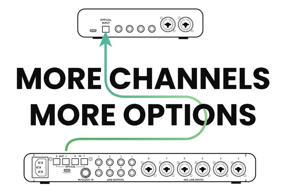 Большие сессии требуют большего количества каналов. Расширение существующего аудиоинтерфейса с помощью ADAT может быть наиболее экономно-эффективным решением масштабирования вашей студии. EVO SP8 имеет восемь микрофонных/линейных входов, восемь линейных выходов и 2 соединения ADAT, что обеспечивает достаточную мощность ввода/вывода для работы с несколькими микрофонами, например, для записи барабанов или полной группы.