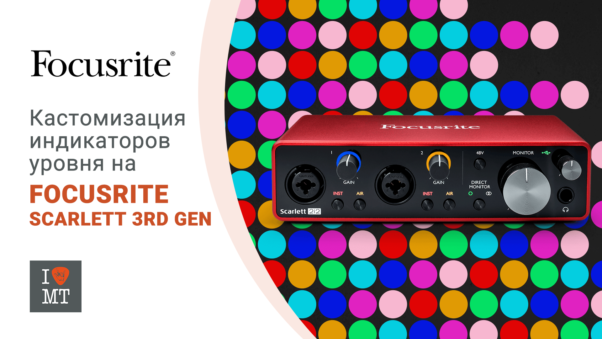 Настройка отображения цвета Gain Halo доступна только для интерфейсов Scarlett 3-го поколения (за исключением 18i20). Индикатор усиления нельзя настроить на Scarlett 1-го, 2-го поколения, или на интерфейсах Clarett.