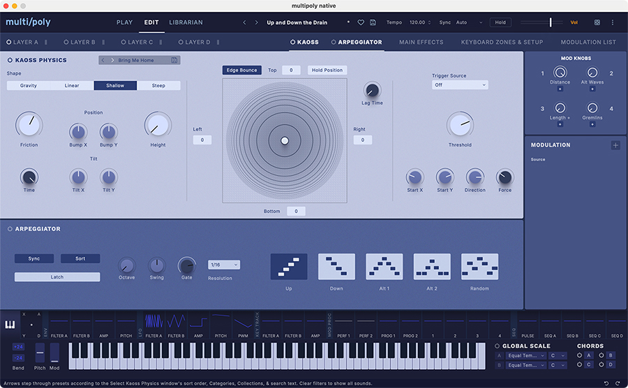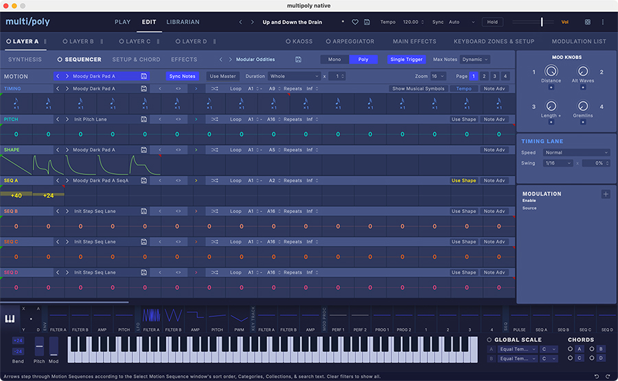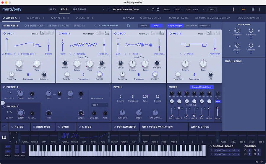 Модуль multi/poly оснащен переработанными фильтрами и осцилляторами с невероятным звучанием, а его возможности в аналоговом моделировании выходят на новый уровень. Каждый голос имеет виртуальную голосовую карту, моделирующую вариации компонентов аналогового оборудования: осцилляторов, фильтров, огибающих, LFO и портаменто. Это позволяет каждому голосу носить уникальный характер, создавая естественно богатые тембры. Вы можете настроить степень этой вариации для каждого звука в отдельности.