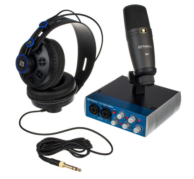 Эта звуковая карта имеет максимальную частоту дискретизации 96 кГц, пару комбинированных XLR/Jack входа, выделенное управление уровнем аналогового стерео выхода и прочный алюминиевый корпус. Отдельно стоит отметить разъемы MIDI in/out на задней панели, которые могут стать решающим фактором при выборе для тех, кто планирует активно использовать в своей работе MIDI интерфейс. В бандл также входит студийный конденсаторный микрофон PreSonus M7 с кардиоидной диаграммой направленности. Эта модель отлично подойдет как для записи вокала, так и для акустических инструментов. Также прилагается 3-метровый XLR-кабель и адаптер для крепления микрофона на стойку. За воспроизведение звука в этом студийном комплекте отвечают наушники PreSonus HD7 с 50-миллиметровыми излучателями, которые зарекомендовали себя как надежный и качественный продукт. AudioBox 96 Studio включает также всю необходимую коммутацию и ПО Studio One 3 Artist с целым рядом плагинов в комплекте, что позволит начать работу без дополнительных затрат.