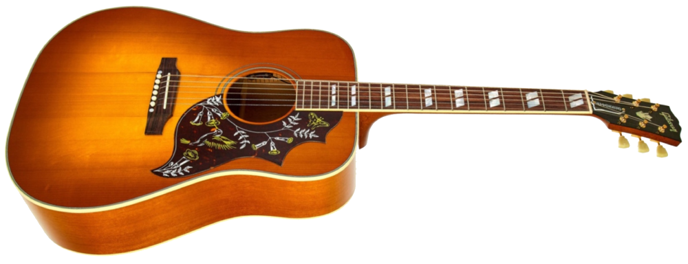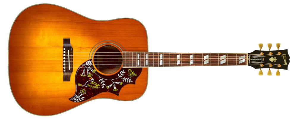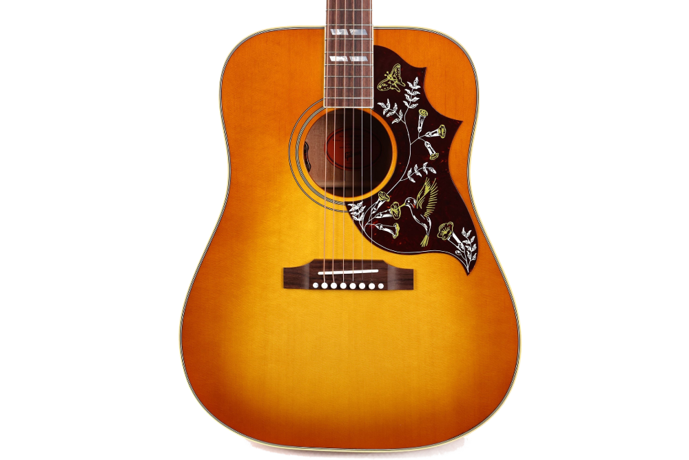 Hummingbird стала першим дредноутом Gibson шириною 16" з додатково широкими «плечима» у верхній частині корпусу – формою, відомою як square-shouldered. Щоб підкреслити значущість нової моделі, Gibson оснастили оригінальну Hummingbird ефектними деталями – подвійними паралелограмами на накладці грифа, багатошаровим окантуванням та модернізованим пікгардом із гравіюванням колібрі й квітів. Як швидко зрозуміли вимогливі гітаристи, під цією яскравою «вітриною» ховається цілісний, висококласний інструмент. Те саме відчуєте й ви, щойно візьмете до рук Gibson Hummingbird Original.