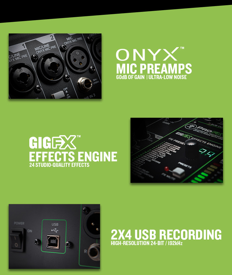 Тепер PROFXV3 можуть похвалитися мікрофонними передпідсилювачами Onyx, що пропонують 60 дБ хедрума, 24 вбудованими ефектами на движку GigFX і багатьом іншим. Записуйте треки у якості 24-біт/192 кГц завдяки 2x4 USB аудіоінтерфейсу й апаратному моніторингу з нульовою затримкою. Крім цього, вони постачаються разом з програмним забезпеченням/наборами плагінів Pro Tools | First і Waveform OEM.