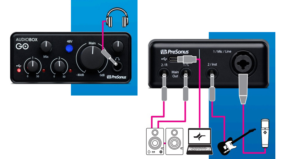 PreSonus AudioBox GO – это аудиоинтерфейс “карманного” размера, со всеми разъемами, что необходимы для подключения профессиональных вокальных XLR-микрофонов, гитар, синтезаторов, наушников и студийных мониторинговых колонок, поэтому он идеально подходит для ноутбуков и ПК. AudioBox GO подключается по USB, поэтому не нужно загружать и устанавливать специальные драйверы или приложения.